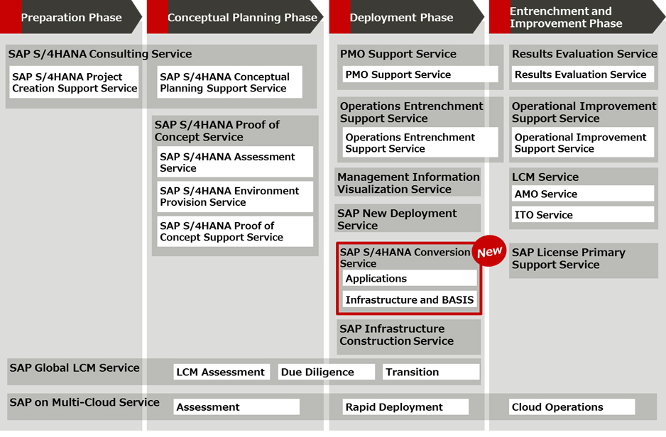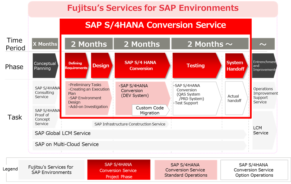 By combining this service with other existing services provided by Fujitsu, such as the SAP S/4HANA Consulting Service, the SAP S/4HANA Proof of Concept Service, LCM Service, and the Operations Improvement Support Service, Fujitsu offers full support for customer businesses with the SAP system, from conceptual planning of the new system prior to migration and maintenance to post-migration operational improvements.