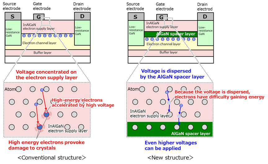 By inserting the newly developed high-resistant AlGaN spacer layer, the voltage within the transistor can be dispersed across both the electron supply layer and the AlGaN spacer layer. By mitigating the concentration of voltage, the kinetic energy increase of the electrons within the crystal is suppressed and damage to the electron supply layer can be prevented, leading to an improved operating voltage of up to 100 volts. This operation voltage corresponds to over 300,000 volts if the distance between the source electrode and gate electrode is one centimeter.