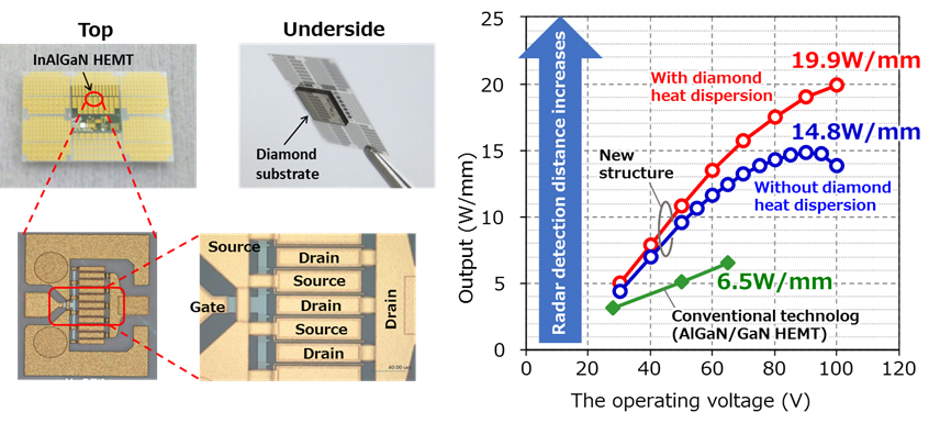 To expand the observation range of equipment like radar, it is essential to increase the output power of the transistors used in power amplifiers. With conventional technology, however, applying high voltage could easily damage the crystals that compose a transistor. Therefore, it was technically difficult to increase current and voltage simultaneously, which is required to realize high-output power GaN HEMTs.