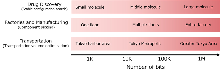 There is demand, however, to go further and provide support for massive problems of a scale greater that those that can be input into hardware so as to solve combinatorial optimization problems of evermore complexity. For example, with computations of around 30 Kbits, it becomes possible to quickly solve stable configuration search problems for molecules of up to 50 amino acids in the field of medium-sized drug discovery. This can accelerate the development of medium-sized drugs. Beyond that, this technology can also be applied to a variety of other fields, including factories and manufacturing as well as transportation.