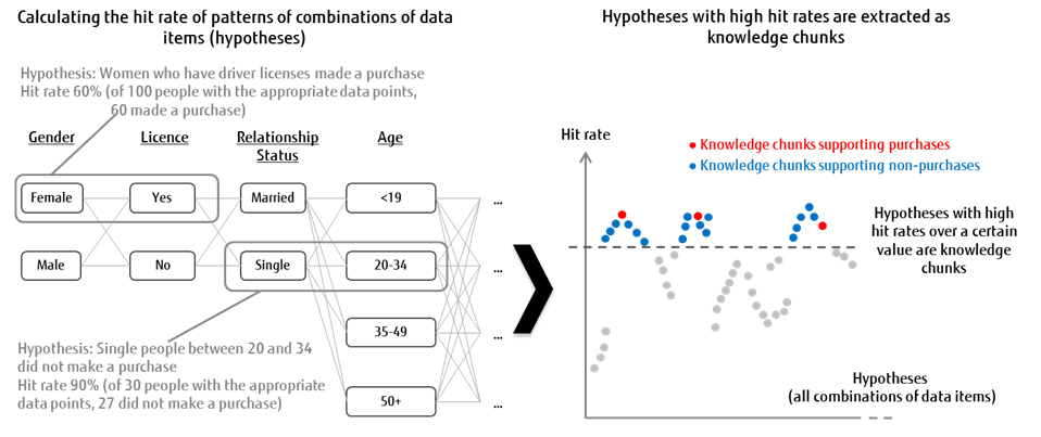 This technology treats all combination patterns of data items as hypotheses, and then determines the degree of importance of each hypothesis based on the hit rate for the label category. For example, when analyzing trends in who purchases certain products, the system combines all sorts of patterns from the data items for those who did or did not make purchases (the category label), such as single women between 20-34 who have driver licenses, and then analyzes how many hits it gets in the data of those who actually made purchases when these combination patterns are taken as hypotheses. The hypotheses that achieve a hit rate above a certain level are defined as important hypotheses, called "knowledge chunks". This means that even when target data is insufficient, the system can extract all hypotheses worth looking into, which may also contribute to the discovery of previously unconsidered explanations.