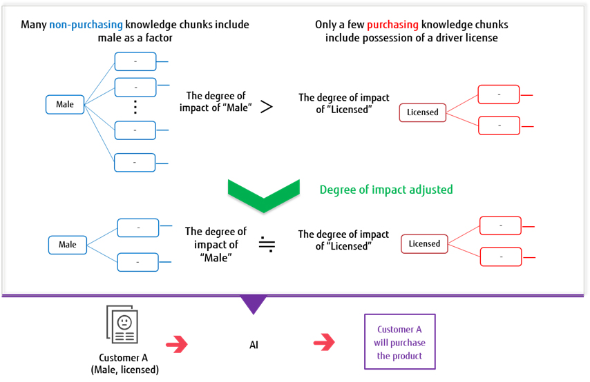 For example, in a case where men who did not make a purchase make up the vast majority of an item purchase dataset, if the AI is trained without controlling the degree of impact, then the knowledge chunk that includes whether or not a person has a license, independent of gender, will not have much influence on the classification. With this newly developed method, the degree of impact of knowledge chunks including male as a factor is limited due to the overlap of this item, while the impact of the smaller number of knowledge chunks that include whether a person has a license becomes relatively larger in training, building a model that can correctly categorize both men and possession of a license.