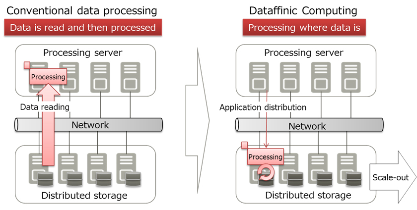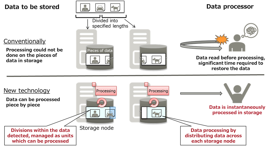 Fujitsu Laboratories has now developed "Dataffinic Computing," a technology for distributed storage systems that handles data processing while also fulfilling their original storage function, in order to speed up the processing of large volumes of data. With this technology, storage systems can process large volumes of data at high speeds, including unstructured data, enabling the efficient utilization of the ever-increasing amounts of data, in such cases as utilizing security camera video, analyzing logs from ICT systems, utilizing sensor data from cars, and analyzing genetic data.