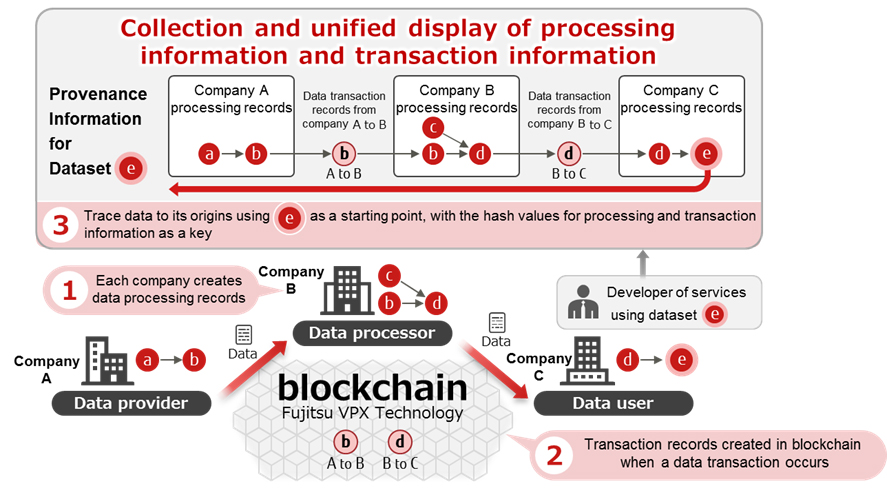 Fujitsu Laboratories developed a technology to connect conventional data processing record information scattered across various companies with data transaction information amongst companies shared via blockchain technology in a way that other companies can also confirm, using the hash values(2) of the processing records and the data transaction information themselves. In a data use environment where data generated or processed by one company is used by another company, the data processing record information is linked in a chain across companies. Because this data structure is constituted in such a way that the hash value of the processing record information from the original, data-providing company is included in the transaction record information of the data-receiving company, while the hash value of the transaction record information is included in the processing record information of the data-receiving company, this technology can trace data across companies and detect falsifications.