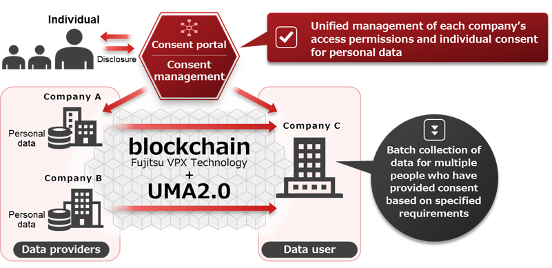 A consent portal for permission to utilize personal information has been deployed on the data exchange platform of Fujitsu VPX Technology(3) network, using UMA2.0(4), an access management protocol standard. This will grant data access rights after confirming individual consent for companies requesting their data. In addition, by linking a request to obtain data with specific conditions (such as sex or age) at the time of the request, it becomes possible to collect batches of personal data for multiple people who have already given permission for use of their data.