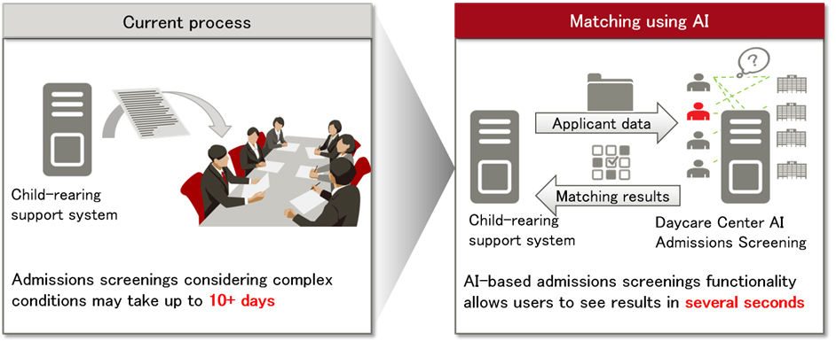 Recent years have seen measures taken to slow the declining birth rate in Japan, including enactment of the "Act on Child and Childcare Support." Many issues still remain, however, in the childcare situation in many regions, such as the number of children waiting for openings at daycare centers. One such issue is increasingly complex daycare admissions screenings due to the need to maintain fairness. The result is that significant manpower and time are required to match children to limited daycare center openings, which takes various circumstances of applicants into account.