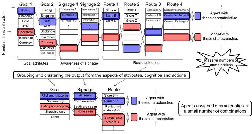 Previously, because data relating to an agent’s attributes, cognition, and actions (e.g. the agent’s goal being “eating lunch” or the agent having seen a sign at location A), which get expressed in the form of dozens of database entries, would all be combined to form the agent’s characteristics, this process would generate a massive number of combinatorial patterns. With this new technology, which creates logical groups that include similarities in traits and generates clusters of agent characteristics for each group, it becomes possible to reduce the number of combinatorial patterns (Figure 2). This enables the discovery of causes that are directly connected to countermeasures, and answers the question of what sort of measures would be effective in changing the cognition or actions of people with specific sets of attributes.