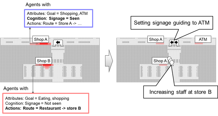 For example, with regard to congestion occurring at store A and store B in a shopping complex, by taking note of "cognition" it could be determined that the congestion in store A was caused by people who had seen signage, and looking at "actions," the congestion in store B was caused by people that finished eating at a restaurant and all came to the store together (Figure 3). This means that the congestion at store A can be effectively dealt with by setting new signage to guide users for other goals, such as use of ATMs, and the congestion at store B could be handled by increasing staff or transaction speed.