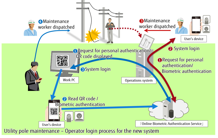 Now, by adopting Fujitsu's Online Biometric Authentication Service for authentication when maintenance workers login to the system from work PCs and smartphones, the convenience of personal identification has increased, strengthening security and improving operational efficiency.