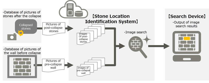 The system increased search accuracy by applying image optimization technology that made features stand out, such as cutting out only the parts of the image with the stones, or emphasizing the brightness of the surfaces of the stones or wall. Then, by using high-speed partial image search technology to extract images that fully or partially matched a certain stone, images with a higher degree of similarity were identified. This answered the question of where collapsed stones were located in the wall prior to the collapse. This process was repeated in an effort to improve accuracy and shorten search times.
