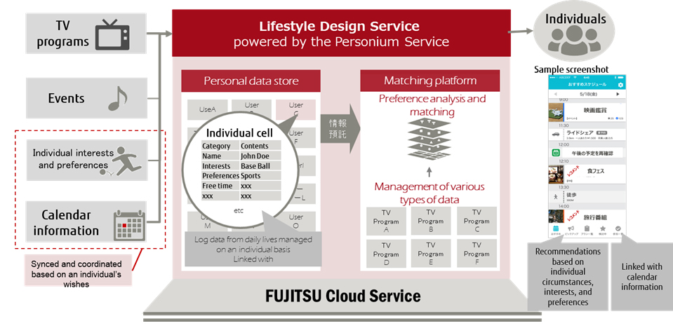 The service built for this field trial will make it possible for individuals to use personal data in lifestyle design by drawing on their own Google Calendar data and linking it with a newly developed application from Fujitsu. By linking data on individual interests and hobbies with information from various companies, such as events and media programing and information from local government regarding regional activities, this service will deliver personalized recommendations for a variety of users. This field trial will offer custom recommendations for TV programs for instance.
