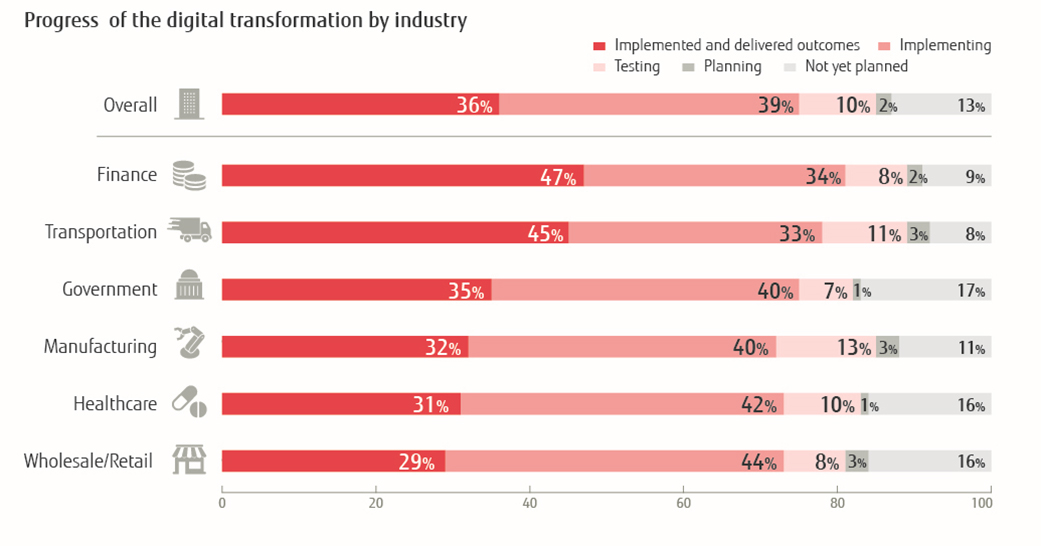 87% of companies surveyed have already begun their digital transformation journey. Players in financial services and transportation companies were found to be the most advanced in their initiatives. About half of companies in these industries delivered positive outcomes.
