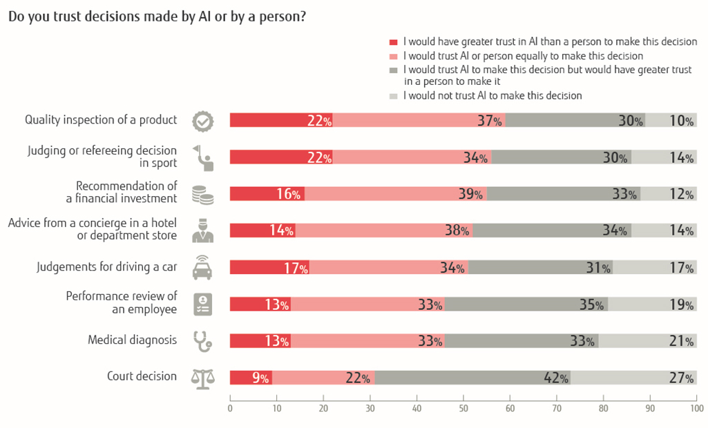 Respondents remain uncertain whether they better trust decisions made by AI or by a person. Our survey shows that respondents tend to trust decisions made by AI more in situations where the human impact is less significant. Moreover, 63% of respondents said that they would trust decisions made by AI if the AI shows substantial reasons for reaching the decisions, and 66% indicated that they would trust a company that published a code of ethics governing the use of AI.