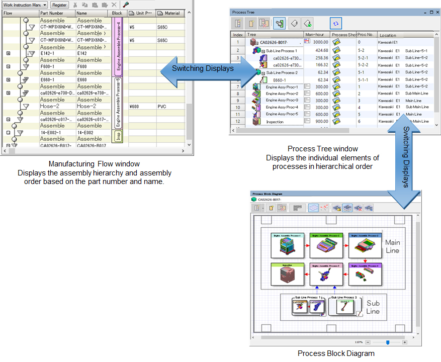 Due to this version's ability to switch from the overall view of the process tree window to an overall view of the components added in each individual process, or to attribute overviews, including storage locations, man-hours, or the time required for the process as a whole, it can easily pull out necessary process information. This allows users to efficiently engage in highly-accurate process planning.