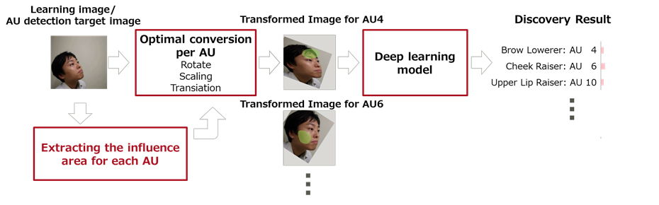 In order to "read" human emotions more effectively, it's critical to capture the subtle facial changes associated with emotions like understanding, bewilderment, and stress. To accomplish this, developers have increasingly relied on Action Units (AUs), which express the "units" of movement corresponding to each muscle of the face based on an anatomically based classification system. For example, AUs have been used by professionals in fields as varied as psychological research and animation. AUs are classified into approximately 30 types based on the movements of each facial muscle, including for eyebrow and cheek movements. By integrating these AUs into its technology, Fujitsu has pioneered a new approach to detect even subtle changes in facial expression. To detect AUs with greater accuracy, large amounts of data are required by the underlying deep learning techniques. However, in real-world situations, cameras usually capture faces at various angles, sizes, and positions, making it difficult to prepare large-scale learning data corresponding to each visual/spatial state. Therefore, the camera-captured images adversely impact detection accuracy.
