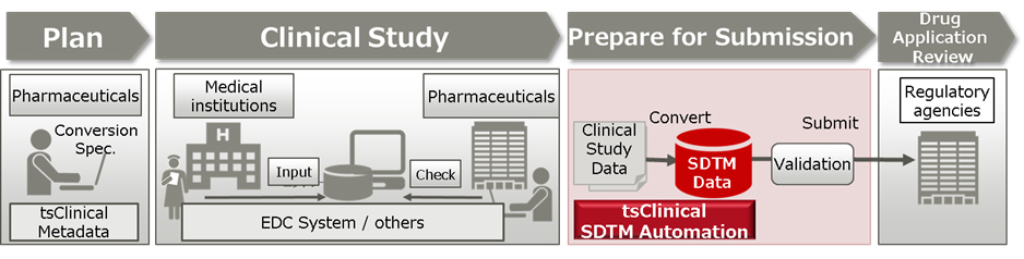 This solution is available as an optional add-on for users of tsClinical DDworks21/EDC plus, Fujitsu's case data collection system for clinical trials. It also supports data collected with EDC systems from other companies and data collected by outside institutions that conduct clinical tests(4). This means that it is capable of generating SDTM data regardless of the customers' different collection systems.