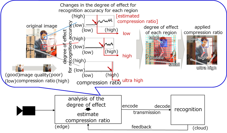 The effect of image quality degradation specific to compression on recognition accuracy is analyzed for each area. The compression ratio that does not affect recognition accuracy is automatically estimated based on the AI recognition results (Figure 2).