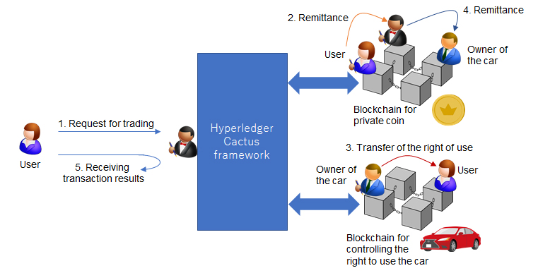 For example, by applying the infrastructure of Hyperledger Cactus in car-sharing services, a new service can be created in which a driver can temporarily use a car in exchange for transferring private coins, while linking a car-sharing service blockchain that manages the rights of car usage, with a blockchain handling private coins (Figure 1). Unlike conventional blockchains, which cannot integrate different blockchains or get excess money back from remitted coins, the Hyperledger Cactus framework automatically links different blockchains. Moreover, the technology can monitor the results of such operations, enabling the rapid development of integrated services that combine multiple blockchains.
