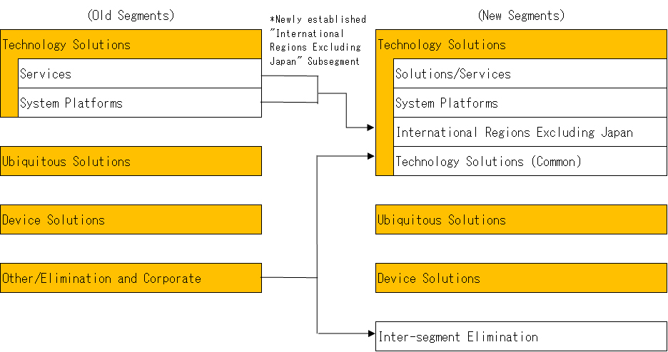 The international businesses included in "Services" and "System Platforms" under "Technology Solutions" have been separated and integrated into the newly-established "International Regions Excluding Japan" subsegment. At the same time, the name of the "Services" subsegment has been changed to "Solutions/Services."