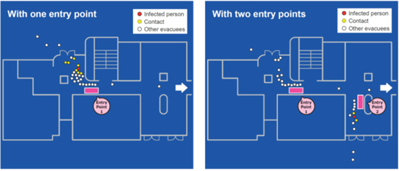 This technology, developed by the International Research Institute for Disaster Science at Tohoku University, the Earthquake Research Institute at the University of Tokyo, and Fujitsu Laboratories Ltd., can simulate changes in the risk of infection due to differences in crowd flow by incorporating a COVID-19 infection risk assessment function into the existing technology, which reproduces crowd flow under various conditions. With this technology, it is possible to predict how infection will spread along with the flow of people, assuming that there is a person infected among the evacuees--people that remain within a certain distance of the infected person for a certain period of time are designated as a potential risk of infection.