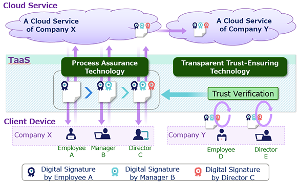 Fujitsu has successfully confirmed that the business data approval process works correctly without changing the user interface on the client device side when a TaaS layer is built on the cloud and used in combination with a commercial cloud service. This enables users to ensure the authenticity of their data for projects across multiple departments within their company.