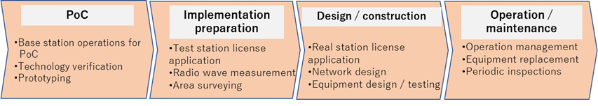 "Private Wireless Managed Services" provides one-stop services for smooth implementation of private wireless systems and for use in real business operations; including PoC (Proof of Concept), license application and radio wave measurement, design and construction, operation and maintenance of the system.