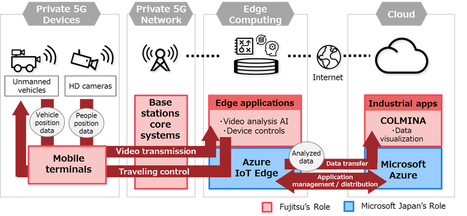 - Private 5G is utilized to transmit high-definition images of the movement of people and unmanned vehicles, and operation data from mobile terminals and servers to Azure IoT Edge.