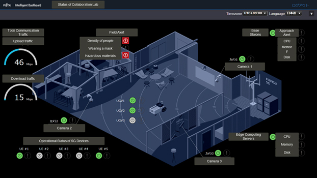 Using Microsoft Azure IoT Edge(1) in the "Fujitsu Collaboration Lab," a private 5G verification facility in Kawasaki, Japan, this system analyzes high-definition images of people moving in the private 5G network and operating data from cameras, mobile terminals, servers, and other equipment. This enables integrated visualization of the status of people, unmanned vehicles, and equipment with the Fujitsu Manufacturing Industry Solution COLMINA(2), unifying private 5G and cloud environments to bring about a system with optimized for network and processing load.