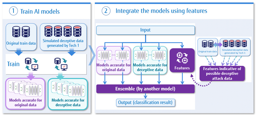 Using the original learning data set and the simulated attack data set generated with the new technique described above, two kinds of AI models are constructed: an AI model which works accurately for the original learning data and an AI model which works accurately for deception attack data (Figure 3) and the decision results of the two AI models are integrated by ensemble learning(2) using features indicative of possible deception attack data. In the case a cyber-attack is detected, it becomes possible to use ensemble learning to automatically and appropriately train AI models to decide which AI model's decision should be strongly reflected, since the number of log rows of communication log data and the number of duplicate log rows are used as indicative features. As a result, this technique increases the robustness to deception attacks while keeping loss of accuracy in the original data under control.