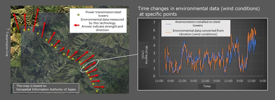 (Right) Comparison of environmental data (wind conditions) converted from vibration data with an anemometer installed on a steel tower