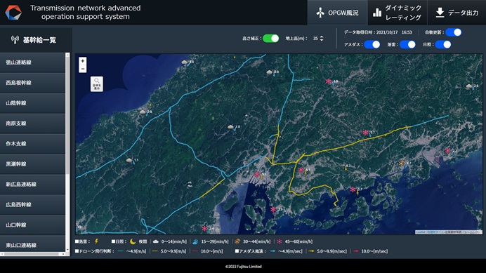 - creation of a prototype system by Fujitsu to support advanced transmission network operations and visualize various types of data (environmental data (wind conditions) and transmission line temperatures) obtained during the field trials on a map