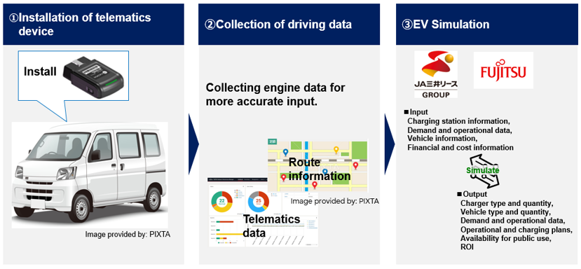 Using telematics devices including drive recorders installed in JA's gasoline-powered vehicles, JA Mitsui Leasing and Fujitsu will collect data including location information and driving history. This data will be used in conjunction with the functions planned to be implemented in a service developed by Fujitsu (1) which supports EV implementation and operation, and Fujitsu’s Social Digital Twin technology (2) to conduct operational simulations, including charging timing and business operations using EVs, based on actual usage data. Through these trials, the two companies aim to alleviate concerns regarding operational management, including vehicle costs and charging infrastructure development, often faced by customers considering EV adoption. By facilitating smooth EV implementation, this initiative contributes to CO2 emission reductions and the realization of sustainable mobility. Furthermore, leveraging this collaboration, JA Mitsui Leasing and Fujitsu will work with local governments and transportation operators in Japan to establish decarbonized social model regions.