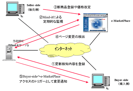 seller-sideからの新商品案内、特定商品の値下げなどを自動で検知し、必要とするbuyer-sideに通知することが可能です。特にオープン系のe-MarketPlaceで、参加企業は固有の条件設定が可能なのでアクセスのためのトリガーとして有効です。
