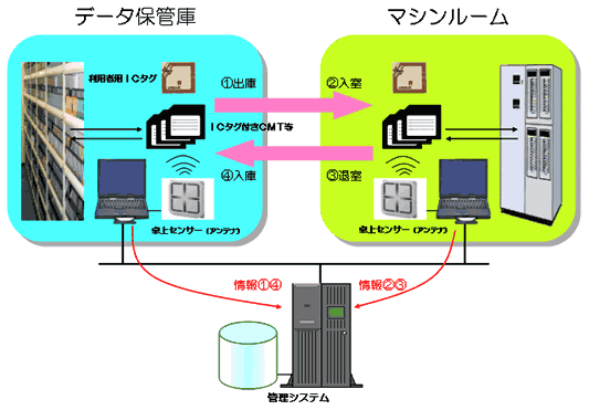 「磁気媒体個体管理システム」は、磁気媒体ごとに貼り付けるICタグと、オペレータが保有する利用者用ICタグ、データ保管庫やマシンルームの出入口に設置されたアンテナ、これらを活用し磁気媒体の入出庫や現在の所在を固有IDで管理するソフトウェアで構成されており((注)図1)、以下の特長でデータセンタの安全性をさらに高めて行きます。