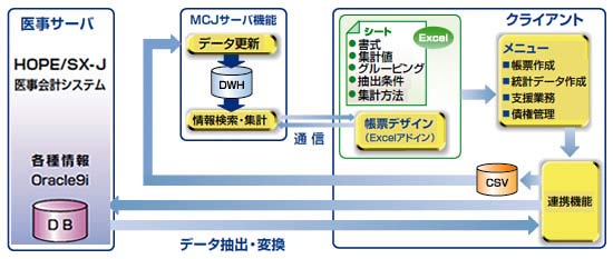 本システムは、中堅病院向け医療事務システムHOPE/SX-J(富士通株式会社製)をご利用の病院様向けのシステムで、病院経営者はHOPE/SX-Jの医事会計データを基に統計をとり、データを戦略的に活用することで、医療の質、運営効率、コスト等について評価できる点・問題となる点の把握が容易になります。病院経営指標などの統計資料についてあらかじめ用意された定型フォーマットにより標準的な資料が容易に作成できるのに加え、利用するデータを自由に指定して、独自の統計資料を作成することもできます。表計算ソフト「Excel」とシームレスな連携をとっているため、簡便な操作性と低価格を実現しており、作成された統計資料は自由に再加工することも可能となっております。