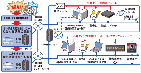 本システムは、あらかじめ登録された地点における震度や地震到達時間を予測して画面や音声、警告灯などで危険を告知する「予測表示クライアント」、「予測表示クライアント」から発信される危険告知メッセージを個々のパソコン上で表示し、作業中の文書等があれば自動的に保存しシャットダウンまで行う「ポップアップ危険告知クライアント」、気象庁からの緊急地震速報を複数の「予測表示クライ アント」に再配信する「再配信サーバ」から構成されております。
