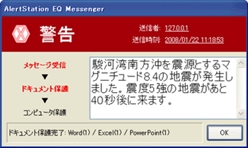 予測表示クライアントが発する危険告知メッセージを受信し、ポップアップ危険告知クライアントがインストールされているパソコンの画面上に警告を表示するシステムです。警告を発すると同時に作業中 のファイルを自動保存することができ、地震発生までに余裕がある場合にはパソコンをシャットダウンすることも出来ます。