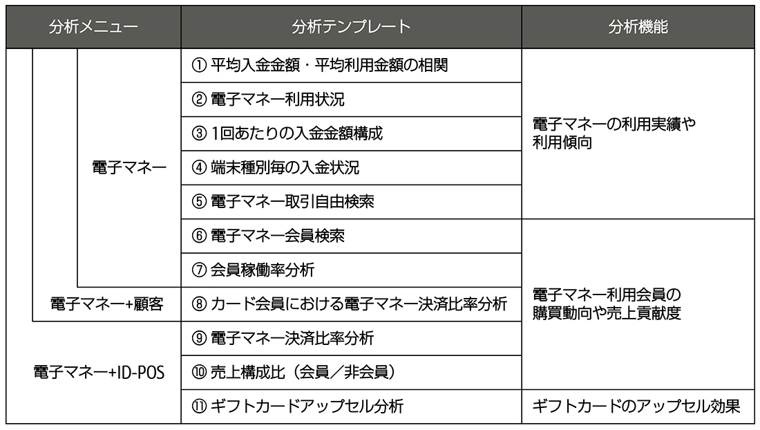 「ValueFront Analytics」は、顧客データと商品購買データを掛け合わせたID-POSデータを分析するクラウド型のサービスです。今回新たに搭載した機能は、電子マネーの利用履歴データなどから、電子マネーの利用状況や傾向、効果のほか、会員の決済比率や購買動向などを分析するものです。これにより、電子マネーの効果を把握し、さらなる利用促進に向けてデータに基づいた施策の検討が可能になります。
