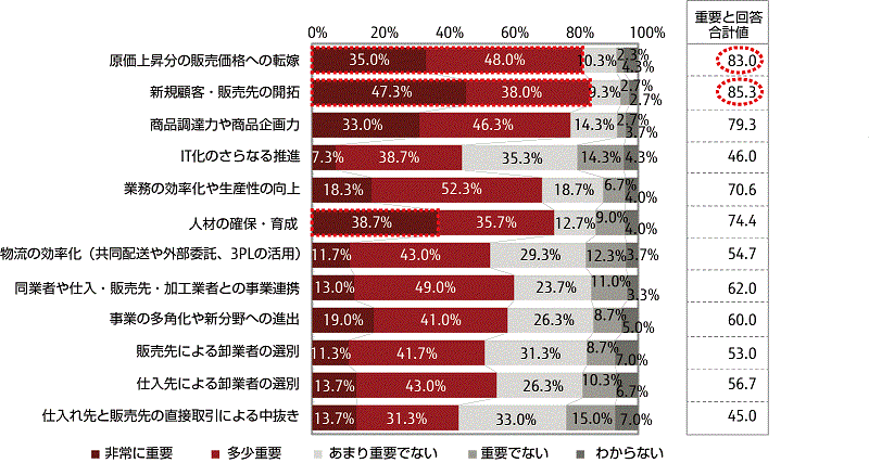 - 経営上の課題の重要性は、「新規顧客・販売先の開拓」や「原価上昇分の販売価格への転嫁な」どの項目で重要性が高い傾向で、特に非常に重要の回答が高かった項目は「、新規顧客・販売先の開拓」や「人材の確保・育成」が高い。