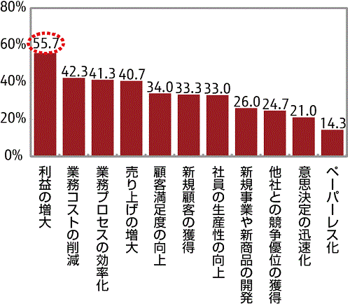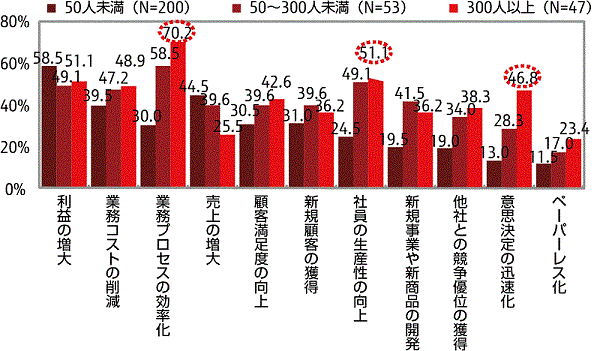 - IT化を通じた社内改革として取り組みたいことは、「利益の増大」が約56%と最も高い。次いで、「業務コストの削減」、「業務プロセスの効率化」が続く。これを従業員数別にみると、300人以上では、「業務プロセスの効率化」や「社員の生産性の向上」、「意志決定の迅速化」などが高い傾向が表れている。