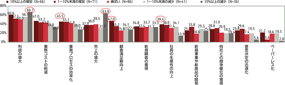 - 3年前と比較した販売高の伸び率別にみると、10%以上減少している企業では、「利益の増大」や「売上の増大」などが高いく、10%以上増加している企業では、「顧客満足度の向上」が最も高い。他には、「業務プロセスの効率化」や「社員の生産性の向上」なども高い傾向にある。