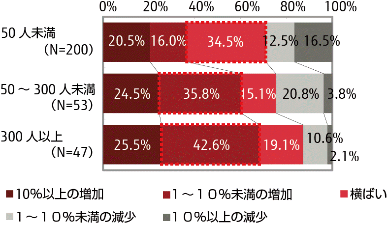 - 従業員の規模別に見てみると300人以上では、68%の企業で販売高が伸びており、50~300人未満では横ばいの割合が減少し、10%未満の増加傾向が高くなっている。また、50人未満では、横ばいが最も多く販売高が伸びている企業と減少している企業が二分されている(図2)。