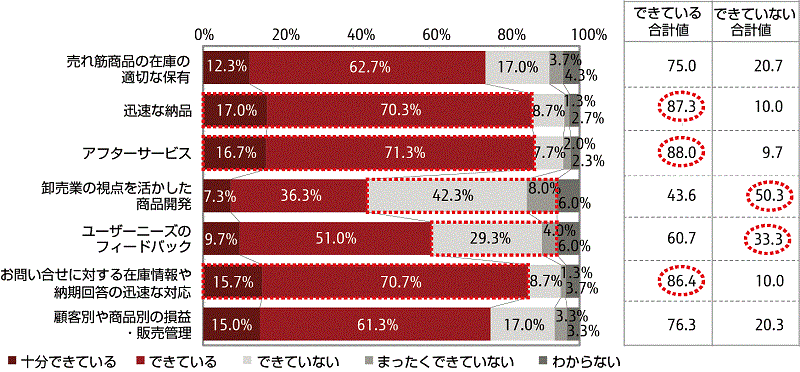 - 卸売業における現場の対応状況として、「アフターサービス」や「迅速な納品」、「お問い合せに対する在庫情報や納期回答の迅速な対応」ができていると回答した割合が80%を超えており、「卸売業の視点を活かした商品開発」や「ユーザーニーズのフィードバック」などは十分な対応ができていないと回答。