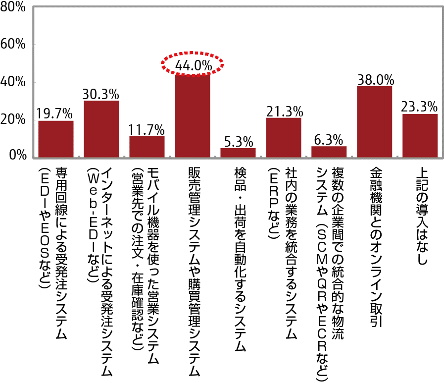 「販売管理」「EDIなど受発注」などIT導入は進んでいるがその活用度は低い。