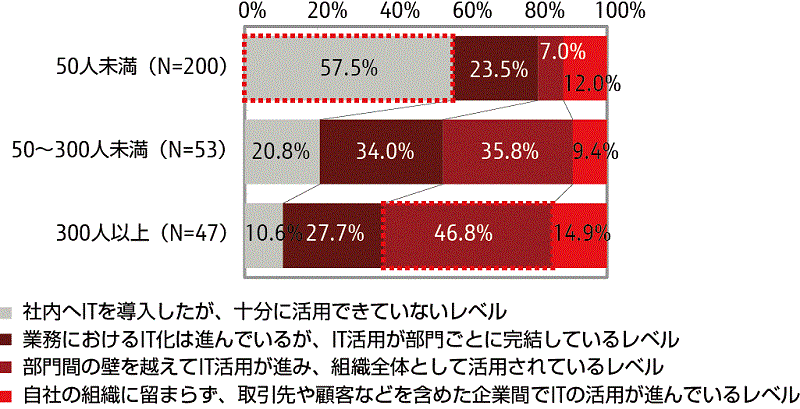従業員数別にみると、50人未満で「社内へITを導入したが、十分に活用できていない」が約58%と高く、300人以上では、「部門間の壁を越えてITの活用が進み、組織全体として活用されている」が約47%と高くなっている。