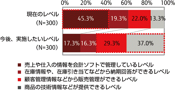 - 自社の販売管理の実施状況レベルは、「売上や仕入の情報を会計ソフトで管理している」が最も高く約45%を占めるが、今後、実施したいレベルは、「商品の技術情報などが提供できる」が約37%、「顧客管理情報などから販売管理ができる」が約29%を占めた。