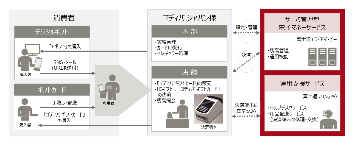 株式会社富士通マーケティング(注1 )(以下 富士通マーケティング)と富士通エフ・アイ・ピー株式会社(注2 )(以下 富士通エフ・アイ・ピー)は、ゴディバ ジャパン株式会社(注3 )(以下 ゴディバ ジャパン)様が9月3日(月曜日)から取り扱いを開始するプラスチック製のギフトカードと、スマートフォン上でプレゼントが可能なデジタルギフトに向けて、「FUJITSU リテイルソリューション サーバ管理型電子マネーサービス(以下 サーバ管理型電子マネーサービス)」およびギフトマネー用の決済端末、「運用支援サービス」を提供いたします。