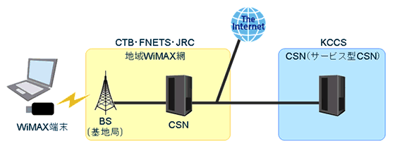 今回の実証実験では、CTBが大分県別府市・日出町で展開している地域WiMAX網と、KCCSが構築したサービス型CSNをWiMAX Forumに準拠した形で接続し、地域WiMAXエリア内にある端末が正常に通信できることを確認しました。これにより、地域WiMAX網と外部にあるサービス型CSNが連携してサービス提供を行うことが可能であることを実証しました。