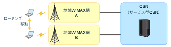 | 注1 | : | CSNとは、Connectivity Service Networkの略で、WiMAX Forumで規定されたWiMAXのコア設備のこと。AAA(認証、認可、課金)、IPアドレス払い出し、端末の移動制御、端末と基地局間で利用される通信暗号化用の鍵生成などを行う。このCSN機能をサービス形態で複数の地域WiMAXへ提供する(サービス型CSN)ことで、地域WiMAX事業者間の連携が容易に実現できる。 |