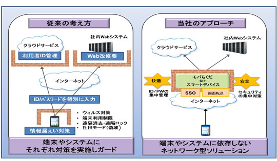 従来、セキュリティ確保のためには、端末側に、あるいは社内システムやクラウドサービス側に、セキュリティのためのしくみを構築する必要がありました。 FNETSの「モバらくだ for スマートデバイス」は、利用端末とアクセスするシステムの間のネットワーク上に強固なセキュリティのしくみを構築することで、どのようなスマートデバイスからも、既存Webベースの社内システムやクラウドサービスに手を加えることなく、「安全かつ快適」に業務ができる環境をご提供します。